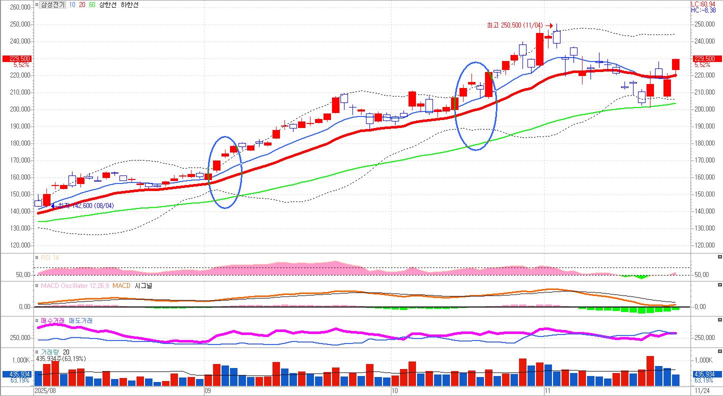 - SMA20에서 양봉 전환 또는 꼬리 지지 발생